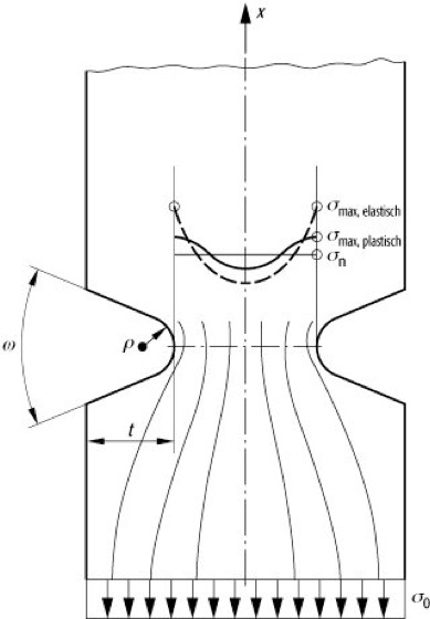 Geometrisch sind der Krümmungsradius ρ, die Kerbtiefe t und der Flankenwinkel ω maßgebend für die Stärke des Kerbeffekts. Bei teilweiser Plastifizierung des Materials ist die Maximalspannung σmax größer als bei einem rein elastischen Material: σmax, plastisch >σmax, elastisch. σn ist die Nennspannung, der Mittelwert der Spannung.