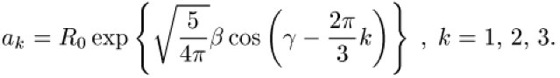 Kerndeformation, Abweichungen der Form eines Kerns von sphärischer bzw. axialer Symmetrie. Die Formeigenschaften der Kerne und die daraus resultierenden Anregungszustände gehen auf eine korrelierte kollektive Bewegung aller Nukleonen zurück, die vorwiegend durch den langreichweitigen Anteil der Kernkräfte hervorgerufen wird. Neben der Anregung von Valenznukleonen treten durch Kerndeformationen zusätzliche Anregungsmöglichkeiten auf: dynamische Deformationen bewirken Vibrationen, statische Deformationen Rotationen des inneren Kerns, die analog zu den Anregungsspektren von Molekülen sind. Während Vibrationsanregungen bereits bei sphärischen Kernen (d.h. Kernen mit abgeschlossenen Nukleonenschalen) auftreten können, werden statische Deformationen durch Nukleonen weitab der abgeschlossenen Schalen durch Polarisation des Kernrumpfes hervorgerufen. Im letztgenannten Fall wird die Deformation üblicherweise unter Beschränkung auf rein ellipsoide Formen (Halbachsen a1, a2, a3) durch die Deformationsparameter β, γ beschrieben: