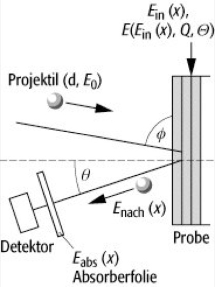 Kernreaktionsanalyse 1: Typische experimentelle Geometrie bei der nicht-resonanten Kernreaktionsanalyse. E0: Energie der eingeschossenen Teilchen (z.B. Deuterium, typisch 1,5 MeV), Ein(x): Energie des Teilchens in der Tiefe x (reduziert durch Energieverlust), Enach(x): Energie des Reaktionsproduktes in der Targettiefe x, Q: Q-Wert, Eabs: Energie des Reaktionsprodukts nach Passieren der Absorberfolie, φ: Einschußwinkel (typisch 90°), θ : Detektorwinkel (typisch 20°), Detektor: Oberflächensperrschichtzähler, Absorberfolie: typisch 10 μm Mylarfolie.