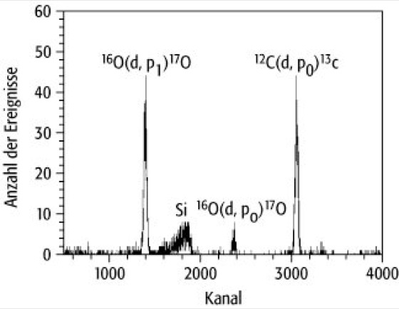 Kernreaktionsanalyse 2: Typisches Kernreaktionsspektrum. Eingeschossenes Ion: Deuterium, Energie: 900 keV; Detektionswinkel 20°; 12 μm Mylarfolie; Probe hergestellt durch 16O-Ionenimplantation in Silizium; resultierende SiO2-Schichtdicke: 40 nm. Tiefenauflösung: 100 nm.