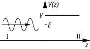 Kleinsches Paradoxon: Eine einfallende freie Elektronenwelle der Energie E bewegt sich im freien Bereich I nach rechts. Für V >E + M wird der vom Potential reflektierte Strom größer als der einfallende.