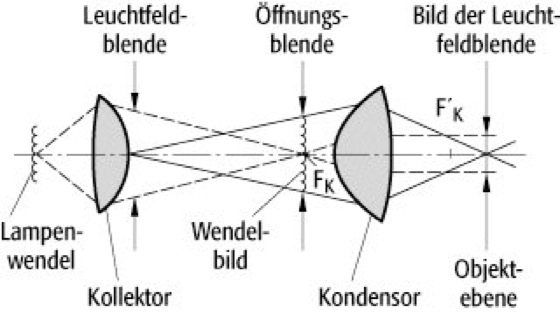 Köhlersche Beleuchtung: Linsenaufbau und Strahlengang.