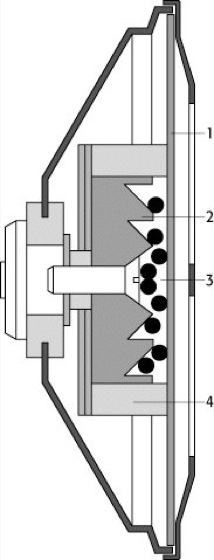 Kohlemikrophon: Längsstrommikrophon, Mikrofonkapsel aus einem Telefon. 1: Kohlemembran, 2: Kohleelektrode, 3: Kohlekörner, 4: Filzring.
