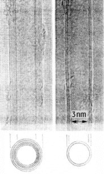 Kohlenstoff-Nanoröhren 1: Transmissionselektronenmikroskopische Aufnahme von mehrschaligen Kohlenstoff-Nanoröhren.
