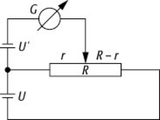 Kompensationsschaltung: Kompensationsschaltung zur stromlosen Messung der Spannung U'. Bei bekannter Spannung U wird der Widerstand R so lange verändert, bis Stromlosigkeit eintritt. Die gesuchte Spannung U' berechnet sich dann nach
