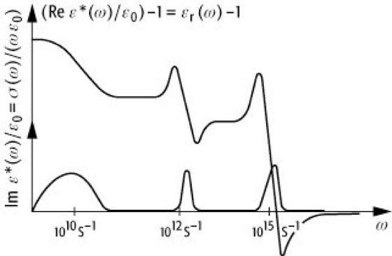 Durch Vergleich mit (3) ergibt sich also σ(ω) = f0Ne² / m(γ0-iω) = σ0 / m(1-iωτ), dabei ist f0N die Dichte der Leitungselektronen, σ0 die Gleichstromleitfähigkeit und τ = 1 / γ0 = meσ0 / Ne² die Relaxationszeit der durch das äußere Feld angeregten Schwingungen der Leitungselektronen. Im Bereich der Resonanzfrequenzen ωi nimmt Reε*(ω) = ε(ω) stark ab und Imε*(ω) wird maximal (anormale Dispersion). In den übrigen Frequenzbereichen ist Imε*(ω) ≈ 0, ε*(ω) ist also reell und wächst langsam mit der Frequenz (normale Dispersion). Wichtige Resonanzen sind die Orientierungspolarisation permanenter Dipole bei ca. 1010 Hz. Der Beitrag der Orientierungspolarisation zu ε*(ω) kann auch mit den Debye-Gleichungen beschrieben werden. Im infraroten Spektralbereich liegen die Schwingungen der Ionen im Kristallgitter und im optischen und ultravioletten Bereich die Verschiebungspolarisation der gebundenen Elektronen. Im Hochfrequenzlimes (harte Röntgenstrahlen und darüber) wird ε*(ω) wieder reell und es gilt ε(ω) ≈ 1-ωPl² / ω² 1 (ωPl: Plasmafrequenz). Bei diesen Frequenzen sind auch Metalle "durchsichtig". Diese Formel gilt auch für ein ideales, stoßfreies Plasma, mit Stößen wird ε(ω) wiederum komplex.