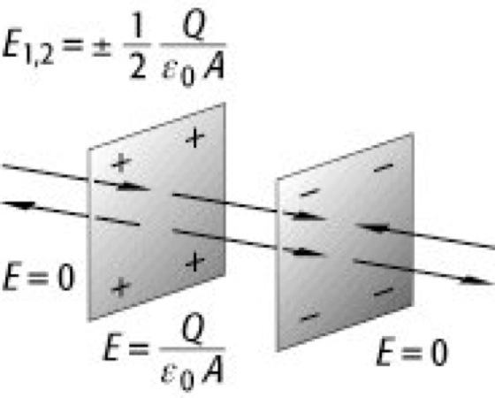 Kondensator 1: Jede der geladenen Ebenen erzeugt ein abstandsunabhängiges elektrisches Feld E1,2. Im Innenraum verstärken sich die beiden Felder, im Außenraum heben sie einander auf.