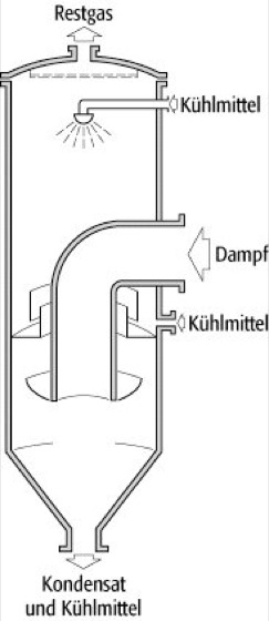 2)Motor- und Vakuumtechnik: Vorrichtung zur Herabsetzung des Dampfdrucks eines Arbeitsfluids bis zur Kondensation. Bei Dampfmaschinen wird der Abdampf im Kondensator mit Kühlwasser gekühlt, das gebildete Kondensat wird abgepumpt und meist wieder als Kesselspeisewasser verwendet; hierdurch erhöht sich die Leistung der Maschine. In der Vakuumtechnik wird die mit der Kondensation verbundene Pump- bzw. Absaugwirkung benutzt (Kondensationspumpe). Am weitesten verbreitet ist der Rohrschlangenoberfächenkondensator (siehe Abb. 5 ), der einfache Herstellung und große Austauschflächen (≈ m2) mit einer hohen Dichtheit und langen Lebensdauer. Ebenfalls einfach in Herstellung und Anwendung und darüber hinaus mit guter Ausnutzung des Kühlmitteles arbeiten Mischkondensatoren (siehe Abb. 6), bei denen das Kühlmittel direkt dem Arbeitsfluid zugeführt wird.