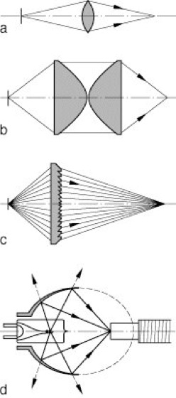 Kondensor: Beispiele für verschiedene Linsen- und Spiegel-Kondensoren: a) asphärische Einzellinsen. b) asphärische Linsen c) Fresnellinse d) Ellipsoidspiegel.