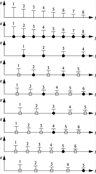 Konsonanz: Konsonanzgrad musikalischer Intervalle: Die Balken der obersten Reihe stellen die Teiltöne eines ersten Klanges dar. In den folgenden Reihen stehen Balken mit schwarzem Punkt für diejenigen Teiltöne eines zweiten Klanges, die mit einem Teilton des ersten Klanges übereinstimmen und Balken mit leerem Quadrat für die nicht mit einem Teilton des ersten Klanges übereinstimmenden Teiltöne des zweiten Klanges.
