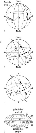: Frühlingspunkt),und d) Galaktisches System (Ä: galaktischer Äquator, Z: galaktisches Zentrum).