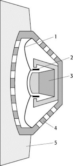Kopfhörer: offener dynamischer Kopfhörer, 1 Membran, 2 Schwingspule, 3 Magnetsystem, 4 Gehäuse, 5 schalldurchlässiges Ohrpolster.