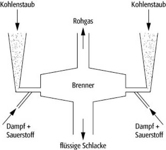 Koppers-Totzek-Verfahren, Verfahren zur Kohlevergasung. Hierbei wird feingemahlene Kohle (Kohlenstaub) drucklos bei Temperaturen von ca. 1 000° C unter Einsatz von Dampf und Sauerstoff zu etwa 2 / 3 in Synthesegas und zu 1 / 3 in Koks umgewandelt. Wegen der hohen Betriebstemperaturen kann auch niederwertige Kohle mit hohen Aschenanteilen (bis zu 40 %) vergast werden. Das erzeugte Rohgasgemisch besteht im wesentlichen aus Kohlenmonoxid CO (≈ 60 %), Wasserstoff H2 (≈ 30 %) und Kohlendioxid CO2 (≈ 10 %). Pro Normkubikmeter (Nm3) Synthesegas (CO + H2) müssen 0,535 kg Kohle, 0,426 Nm3 Sauerstoff und 0,231 kg Wasserdampf eingesetzt werden