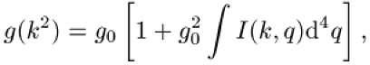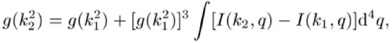 wobei g0 die nackte Kopplung, g(k2) der empirische Wert und I ein Integrand ist, der sich aus der Anwendung der Feynman-Regeln ergibt. Das Integral ist i.a. divergent; allerdings lassen sich die Werte der Kopplungskonstanten für verschiedene Impulswerte zueinander in Beziehung setzen,