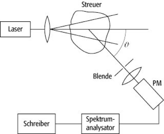 Korrelationsspektroskopie: Licht aus einem Laser wird auf die streuende Probe gelenkt. Das gestreute Licht wird mit einem Photomultiplier (PM) nachgewiesen und mit einem Spektrumanalysator Fourier-transformiert. Mit derartigen Methoden läßt sich z.B. die Größenverteilung mikroskopischer Teilchen mit Durchmessern im Bereich einiger nm bestimmen