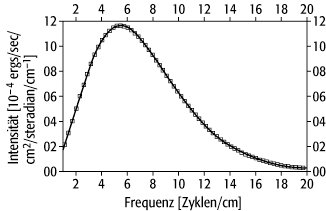 Kosmologie 1: Spektrum der kosmischen Mikrowellenstrahlung, vermessen vom NASA-Satelliten COBE. Die Kästchen sind die Messungen mit ihren Fehlern, die durchgezogene Kurve entspricht einem Planck-Spektrum der Temperatur T = 2,73 K. Aufgetragen ist die Intensität gegen die Wellenzahl.