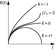 Ausgehend vom jetzigen Zustand läßt sich mit Hilfe der FL-Modelle die Geschichte des Kosmos theoretisch rekonstruieren. Es werden natürlich wegen der Homogenität der Modelle nur zeitliche Veränderungen erfaßt und schon aus diesem Grund können die FL-Modelle nur angenähert gültig sein. Aus den Lösungen der FL-Gleichungen läßt sich entnehmen (siehe Abb. 2 ), daß der Expansionsfaktor ![]()