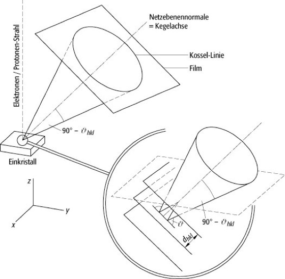 (Braggsches Reflexionsgesetz) erfüllt ist, wird unter dem Bragg-Winkel νhkl reflektiert. Die Indizes hkl bezeichnen dabei die Netzebenen des Kristalls, dhkl ist der Abstand der Netzebenen mit Indizes hkl, λ die Wellenlänge der Röntgenstrahlung und n die Beugungsordnung. Interferenz der isotrop emittierten Primärstrahlung mit der an den Netzebenen reflektierten Strahlung führt zu Intensitätsmaxima der vom Kristall emittierten Röntgenstrahlung. Diese Maxima haben die Form eines Kegels, dessen Spitze im Emissionszentrum liegt und dessen Achse senkrecht auf den Netzebenen des Kristalls steht. Der Effekt wird in der Abbildung verdeutlicht. Ein Einkristall wird mit Elektronen oder Protonen beschossen. Die vom Kristall emittierte Röntgenstrahlung wird mit einem Film detektiert. Je nach Orientierung des Kristalls und des Films werden bestimmte Schnitte des Kossel-Kegels nachgewiesen. In der in der Abbildung gezeigten Geometrie hätte die detektierte Röntgenstrahlung die Form eines Kreises, da die Filmebene senkrecht zur Kegelachse steht.