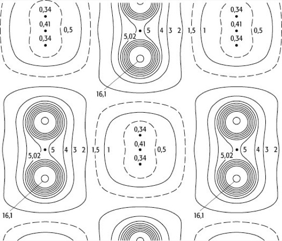 kovalente Isolatoren: Elektronendichte eines Diamant-Kristalls in der {110}-Ebene. Als ein typisches Zeichen eines kovalenten Kristalls ist die Elektronendichte zwischen den nächsten Nachbarn um ein Vielfaches höher als an anderer Stelle (5,02 Elektronen pro 1 000 nm3 im Vergleich zu nur 0,34 in der Gegend der geringsten Dichte). Diese direktionale Ladungsverteilung bestimmt bei kovalenten Kristallen wie dem Diamant die dielektrischen Eigenschaften, z.B. Nichtleiter, große Dielektrizitätskonstante etc.