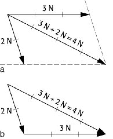 Kräftediagramm: Summenbildung durch a) Parallelogramm-Konstruktion, b) Kräfteplan-Konstruktion.
