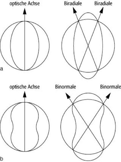 Kristalloptik: a) Schnitt durch die Wellenfläche eines optisch einachsigen (links) und eines optisch zweiachsigen (rechts) Kristalls. b) Schnitt durch die Wellennormalenfläche eines optisch einachsigen (links) und optisch zweiachsigen (rechts) Kristalls.