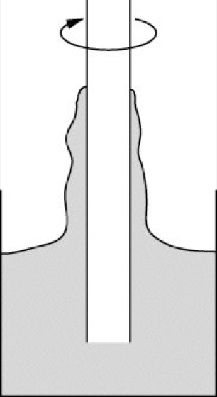 Der Weißenberg-Effekt ist die Tatsache, daß polymere Flüssigkeiten wie Teig beim Rühren am Rührstab hochklettern (siehe Abb. 2); durch die Rührbewegung werden die fadenförmigen Moleküle ausgerichtet, was zu einer Rückstellkraft (statistischen Ursprunges, ähnlich wie bei dem Strecken eines Gummis) führt, der die Flüssigkeit nach oben ausweicht.