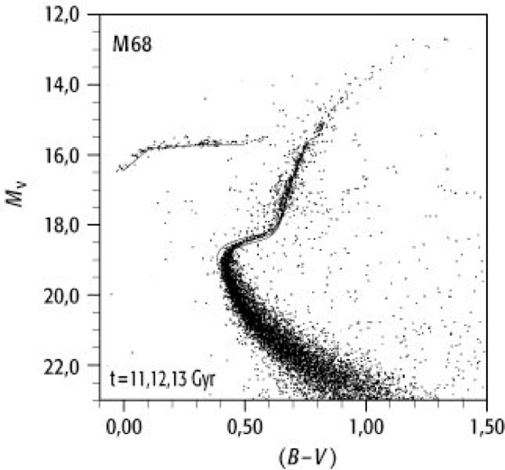 Kugelsternhaufen 2: Für den Kugelsternhaufen M68 zeigt dieses Diagramm die Verteilung der Sterne gemäß Leuchtkraft (gemessen im logarithmischen Maßstab Mv) und Farbe ((B-V) ist ein Farbindex, links: blau, rechts: rot). Hauptreihe und Horizontalast sind klar ausgeprägt. Rechts oberhalb der Hauptreihe befinden sich die Roten Riesen. Sternentwicklungsmodelle (durchgezogene Linien) für ein Alter von 11 bzw. 13 Milliarden Jahren ergeben eine gute Anpassung an den Abbiegepunkt und den Horizontalast.
