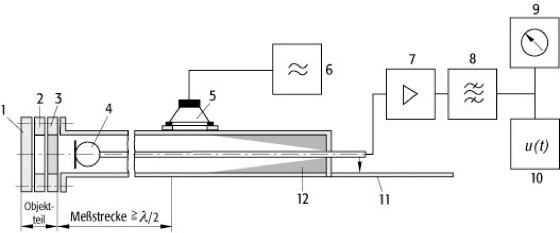 Kundtsches Rohr: für Schallabsorptionsgradmessungen bei senkrechtem Schalleinfall: 1 Abschlußplatte, 2 Paßstück für Wandabstand, 3 Probe, 4 Mikrophon (Druckempfänger), 5 Lautsprecher, 6 RC-Generator, 7 Verstärker, 8 Filter, 9 Anzeigegerät, 10 Oszillograph, 11 Meßskala, 12 reflexionsarmer Rohrabschluß.