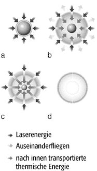 Laserfusion: Schematische Darstellung der Prozesse bei der Laserfusion: a) Plasmabildung durch Laserstrahlen, b) Kompression, c) Zündung, d) Brennen.