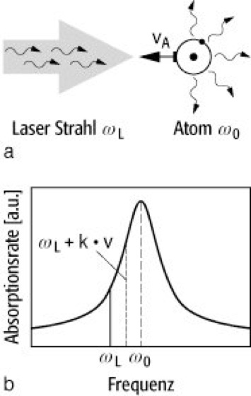 Erreicht man nun, daß schnelle Atome mehr Photonen absorbieren als langsame, so entspricht dies einer Verringerung der mittleren kinetischen Energie des Ensembles von Atomen, d.h. einer Absenkung der Temperatur. Dies geschieht durch Verwendung von Laserstrahlung, deren Frequenz etwas kleiner ist als die Übergangsfrequenz des verwendeten atomaren Übergangs. Atome, deren Geschwindigkeit der Laserstrahlrichtung entgegengerichtet ist, haben dadurch eine höhere Absorptionswahrscheinlichkeit als ruhende Atome. Die Wahrscheinlichkeit, daß ein Atom einen seiner Bewegungsrichtung entgegengerichteten Impulsübertrag erfährt, ist also sehr hoch, d.h. es findet Kühlung statt (Abb.). Die einfachste Anordnung der Laserkühlung besteht aus einem Atomstrahl, dem ein einziger rotverstimmter Laserstrahl entgegengerichtet ist (Atomstrahlkühlung). Besonders interessant wurde die Technik aber durch Verwendung dreidimensionaler Kühlschemata. Dabei wird i.d.R. für jede Raumrichtung ein Paar kollinear gegenläufiger Laserstrahlen gleicher Frequenz verwendet. Durch Kombination mit ortsabhängigen Lichtkräften kann man die Atome außerdem in einem lokalisierten Volumen fangen (Atom- und Ionenfallen).