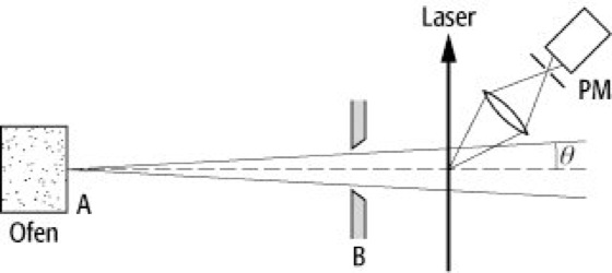 Laserspektroskopie am kollimierten Atomstrahl: schematischer Aufbau. Die Probe wird in einem Ofen verdampft, der entstehende thermische Atomstrahl A durch eine Lochblende B kollimiert und in der Wechselwirkungszone vom Laserstrahl senkrecht überlagert. Die Anregung der Atome im Strahl läßt sich z.B. durch die Messung der Fluoreszenzstrahlung mit einer Abbildungsoptik und einem Photomultiplier PM nachweisen.