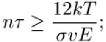 beträgt (v: Relativgeschwindigkeit der stoßenden Teilchen, σ: Fusionsquerschnitt). Das Verhältnis von Heizleistung und Fusionsleistung beider Energiedichten wird als Gain bezeichnet. Um bei gegebener Temperatur einen bestimmten Gain zu erreichen, ist ein gewisser Wert des Produkts aus Plasmadichte und Einschlußzeit notwendig:
