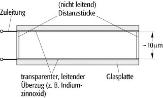 Eine Flüssigkristallanzeige besteht im Prinzip aus einem Plattenkondensator (Kondensator) mit der Flüssigkristallsubstanz als Dielektrikum. Zu ihrer Herstellung bringt man einen Tropfen Flüssigkristall auf eine Glasplatte und deckt diese dann mit einer weiteren Glasplatte ab. Die Innenseiten der beiden Glasplatten sind mit einer transparenten, jedoch elektrisch leitenden Schicht überzogen, die die eigentlichen Kondensatorplatten bilden. Die Dicke der aktiven Schicht wird durch Distanzstücke bestimmt, typischerweise im Bereich von 10 μm (siehe Abb. 1).