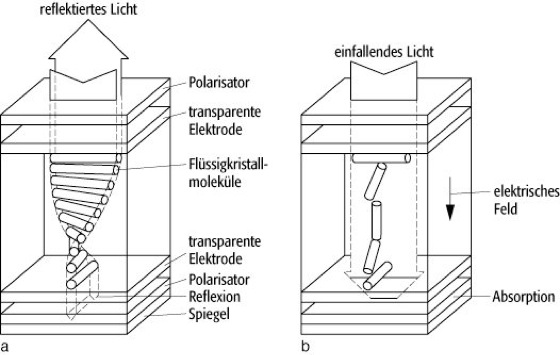 In der häufigsten LCD-Bauart, den sogenannten Twisted Nematics Displays (TND), liegt zwischen um 90 ° verdrehten Polarisationsfolien eine nematische Schicht, deren Stabmoleküle nahe diesen Folien durch besondere Vorbehandlung jeweils parallel zur Polarisationsebene ausgerichtet werden. Dazwischen ändert sich die Einstellung mit der Tiefe stetig wendeltreppenartig (›twisted nematics‹). In gleicher Weise dreht sich bei geeigneter Schichtdicke auch die Polarisationsebene, das Licht geht durch beide Folien zum darunterliegenden Spiegel und wieder zurück: die Schicht sieht hell aus, bis man ein schwaches elektrisches Feld anlegt, das die Moleküle überwiegend parallel orientiert. Dann kommt kein Licht durch die Polarisatoren, der Feldbereich wird dunkel (siehe Abb. 2). Neuere sogenannte ›supertwisted nematics‹ drehen den Polarisationsvektor sogar um 270 ° und erreichen so eine höhere Auflösung.