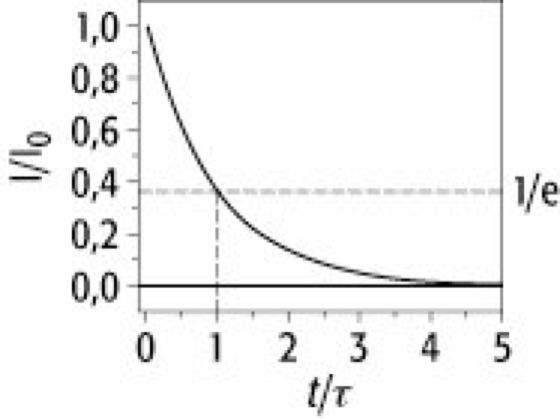 ist die Lebensdauer τ definiert als diejenige Zeit, nach der die Verteilung auf 1 / e ihres Anfangswerts abgefallen ist. Dabei ist I0 der Anfangswert der betreffenden Größe, γ ist die Zerfallsrate. Für die Lebensdauer gilt damit: τ = 1 / γ (siehe Abb. 1).