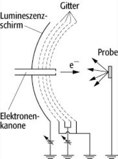 LEED: Aufbau einer LEED-Apparatur. In der Elektronenkanone wird ein möglichst monoenergetischer und paralleler Elektronenstrahl erzeugt und auf die Probe fokussiert. Ein System von negativ vorgespannten Drahtgittern bremst inelastisch gestreute Elektronen ab. Die elastisch gestreuten Elektronen werden, nach Durchgang durch die Gitter, auf einen Lumineszenzschirm nachbeschleunigt, wo das Beugungsbild beobachtet werden kann.