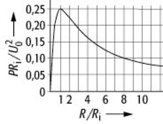 Leistungsanpassung: Abhängigkeit der entnommenen Leistung vom Verhältnis zwischen Verbraucher- und Innenwiderstand einer Spannungsquelle.