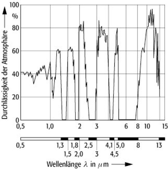 Lichtnachrichtenübertragung: Durchlässigkeit der Atmosphäre nach einer 5 km-Strecke (Sichtweite 25 km) in Abhängigkeit von der Wellenlänge.
