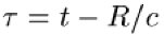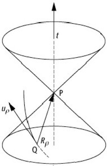 Dabei ist R die dreidimensionale Entfernung zwischen dem Punkt P, in dem das Feld zur Zeit t bestimmt werden soll, und dem Punkt Q, in dem sich die Ladung zur Zeit τ befindet (siehe Abb.). In Q ist die Geschwindigkeit der Ladung zur Zeit τ gleich u. ›ret‹ bedeutet, daß alle auf der rechten Seite auftretenden Größen für die Zeit