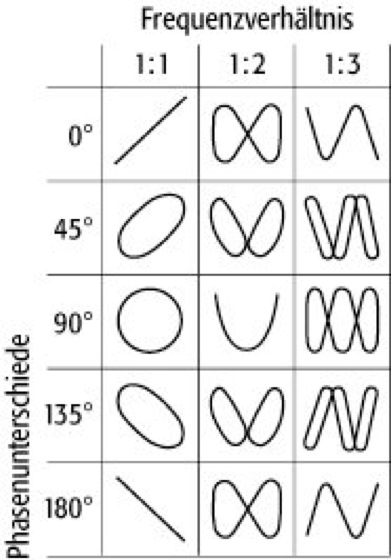 Lissajous-Figuren 1: Je nach Verhältnis der Frequenzen und der Phasenbeziehung ergibt die Überlagerung zweier senkrecht aufeinanderstehenden Schwingungen die oben gezeigten Lissajous-Figuren.