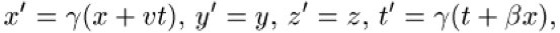 Die spezielle Lorentz-Transformation zwischen zwei Koordinatensystemen, die sich relativ zueinander entlang der räumlichen 1-Achse mit der Geschwindigkeit