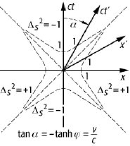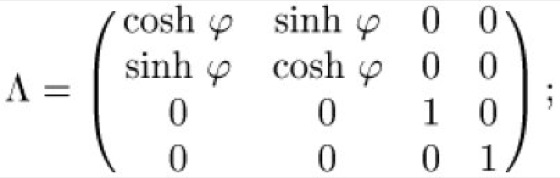 sie erzeugt einen Lorentz-Boost in x-Richtung. Er kann analog zu einer Drehung im euklidischen Raum auch als Pseudodrehung, bei der die Funktionen des Drehwinkels Hyperbelfunktionen sind, aufgefaßt werden (siehe Abb.).