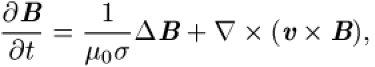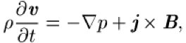 Magnetohydrodynamik, MHD, Theorie des Verhaltens elektrisch leitender Flüssigkeiten in Anwesenheit eines Magnetfeldes. Auch Plasmen, bei denen Stöße und somit dissipative Effekte (Dissipation) eine geringe Rolle spielen, lassen sich durch die Magnetohydrodynamik beschreiben. Die Entwicklung der Magnetohydrodynamik begann in der ersten Hälfte des 20. Jahrhunderts mit theoretischen Arbeiten über das Erdinnere, über die Sonne und über das Plasma im interstellaren Raum. Die experimentelle Erforschung magnetohydrodynamischer Phänomene begann mit Untersuchungen an Quecksilber, später rückten dann Versuche an Plasmen in den Vordergrund, insbesondere im Rahmen der Fusionsforschung. Die Gleichungen der Magnetohydrodynamik verknüpfen den Gradienten des hydrostatischen Drucks Δp mit der Massendichte ρ, der mittleren makroskopischen Geschwindigkeit v und dem Magnetfeld B: