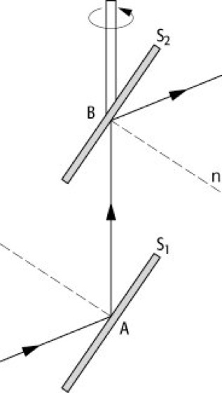 Malussches Gesetz, beschreibt die Intensität eines unpolarisierten Lichtstrahls nach Spiegelung an zwei Spiegeln, deren Einfallsebenen den Winkel ϕ einschließen. Im Malusschen Versuch wird ein Lichtstrahl im Punkt A am Spiegel S1 reflektiert und trifft auf den Spiegel S2, wo er in B reflektiert wird (s. Abb.). S2 ist um die Achse AB drehbar. Aufgrund des Zusammenhanges zwischen Polarisation und Reflexion wird nur der senkrecht zur jeweiligen Einfallsebene polarisierte Anteil des Lichts reflektiert. Die in B reflektierte Intensität Jϕ wird demnach durch