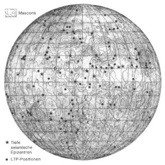 Mascons: Lage von Mascons, von seismischen Epizentren und von Lunar Transient Phenomena. Mascons hängen mit kreisförmigen Maren wie dem Mare Serenitatis zusammen.