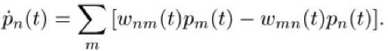 n) zusammen. In dieser Form kann die Master-Gleichung als eine Bewegungsgleichung für die Besetzungswahrscheinlichkeiten pn von Systemzuständen n bei Nichtgleichgewichtsprozessen verstanden werden.