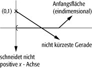 Zunächst benützt man die einfach zu beweisende Tatsache, daß Bahnen frei fallender Teilchen, wenn sie einmal konvergieren, durch die Gravitation in dieser Tendenz höchstens bestärkt werden. Dies drückt nur die anziehende Natur der Schwerkraft aus und gilt schon nichtrelativistisch, sofern alle Massen positiv sind. Letzteres wird in der Einsteinschen Theorie durch die Forderung ersetzt, daß Energiedichte + Druck positiv sein müssen. Man kann dann leicht sehen, daß sich konvergierende Weltlinien nach endlicher Zeit überkreuzen müssen. Dies ist an sich kein Malheur und kann ohne weiteres auch im flachen Raum geschehen, wo die Weltlinien frei fallender Teilchen Geraden sind. Hier setzt nun das geometrische Argument ein, welches benützt, daß die Weltlinien frei fallender Teilchen geodätische Linien sind. Von einer raumartigen Anfangsfläche ist zu jedem Punkt die Bahn mit längster Eigenzeit eine geodätische Linie, welche im Sinne der Lorentz-Metrik senkrecht auf der Fläche steht. Überkreuzen sich aber zwei benachbarte geodätische Linien, können sie nicht Bahnen längster Eigenzeit sein, denn durch Abrunden der Ecke kann man eine Bahn konstruieren, auf der längere Zeit zur Fläche verstreicht. Hier braut sich ein Widerspruch zusammen, denn man wird erwarten, daß es von jedem Punkt eine längste Linie zur Anfangsfläche gibt. Dies läßt sich auch zeigen, sofern jede geodätische Linie durch den Punkt die Anfangsfläche schneidet. Dies ist natürlich zu verlangen, denn schon in der euklidischen Ebene (siehe Abb. 1 ) gibt es vom Punkt (0, 1) keine kürzeste Gerade zur positiven x-Achse ![]()