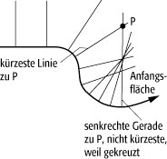 Ferner kann es auch geschehen, daß sich zwar geodätische Linien kreuzen, durch jeden Punkt aber auch ungekreuzte gehen, dann sind eben letztere die extremalen Linien. Dies sieht man wieder in der Ebene, wenn man nach der kürzesten Linie von einem Punkt P zu einer gekrümmten Anfangsfläche fragt. Sie ist die Gerade senkrecht zur Fläche, welche sich nicht mit ihren Nachbarn kreuzt (siehe Abb. 2 ).
