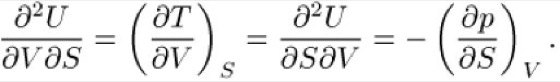 2)Thermodynamik: thermodynamische Relationen, die die partiellen Ableitungen der Zustandsgrößen zueinander in Beziehung setzen. Sie ergeben sich in einfacher Weise aus der Tatsache, daß die thermodynamischen Potentiale Zustandsfunktionen und ihre partiellen Änderungen daher totale Differentiale sind.Beispiel: Die differentielle Änderung der inneren Energie U, die als Funktion der Entropie S und des Volumens V ein thermodynamisches Potential darstellt, kann nach dem ersten und zweiten Hauptsatz in der Form
