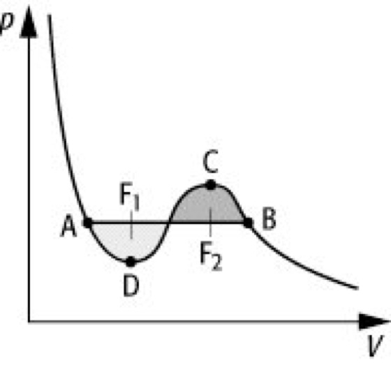 Das Maxwellsche Kriterium ist eine notwendige Folge aus dem zweiten Hauptsatz der Thermodynamik. Wäre etwa F2 >F1, so ließe sich ein Perpetuum mobile zweiter Art konstruieren, so daß über einen Kreisprozeß entlang A-B-C-D-A auf der Van-der-Waals-Isothermen die Arbeit F1F2 gewonnen werden kann. In Folge würde ein Wärmebad abgekühlt werden. Im umgekehrten Fall F2< F1 erhält man das gleiche Ergbnis, wenn der Prozeß in umgekehrter Richtung durchlaufen wird. Demnach ist nur die Bedingung F2 = F1 zulässig.